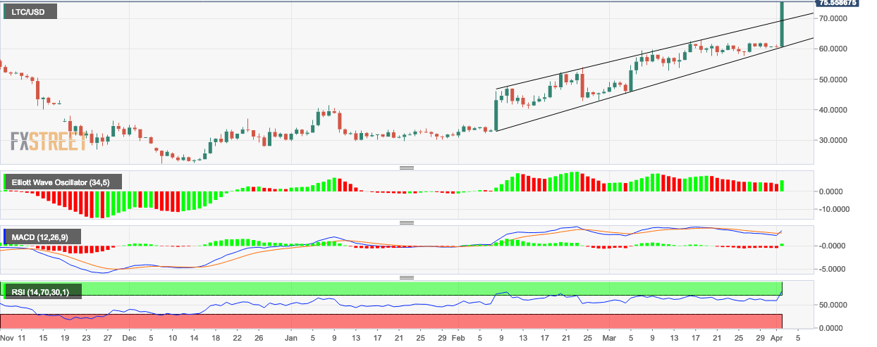 - LTC/USD went up from $61 to $75.50 this Tuesday as the entire crypto market experienced significant gains.