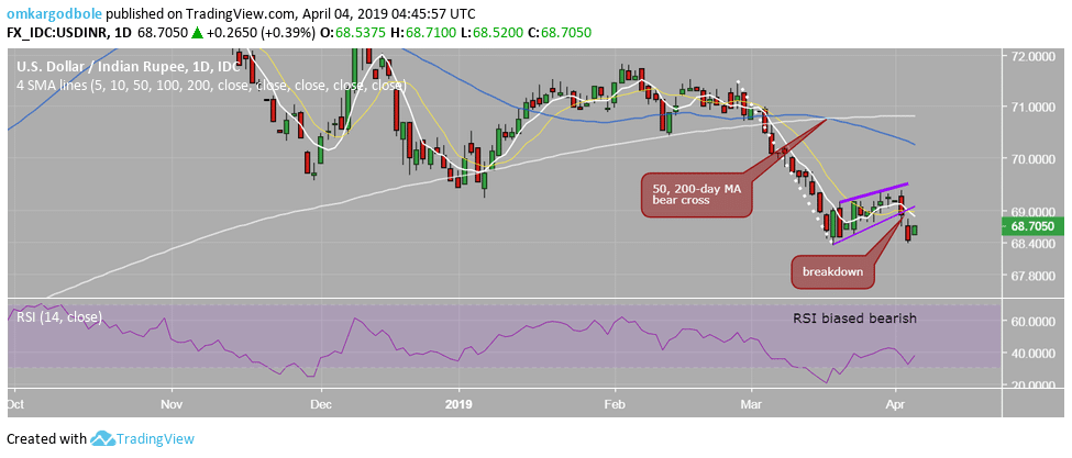 The pair fell 69.00 on Tuesday, confirming a bear flag breakdown on the daily chart. With the pair holding well below 69.00, that bearish continuation pattern is still valid and is supported by the death cross (50- and 200-day MA bear cross confirmed on March 25) and a below-50 print on the 14-day relative strength index (RSI).