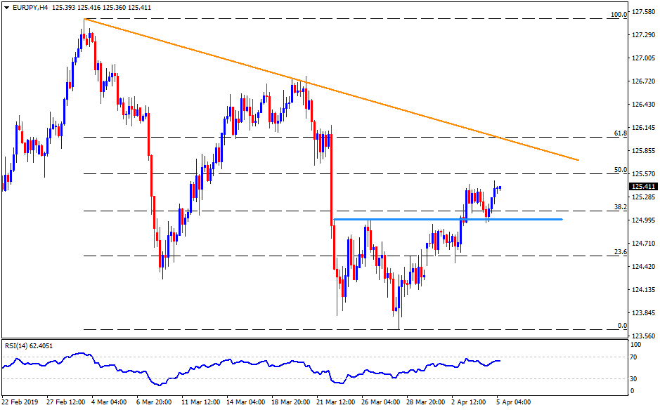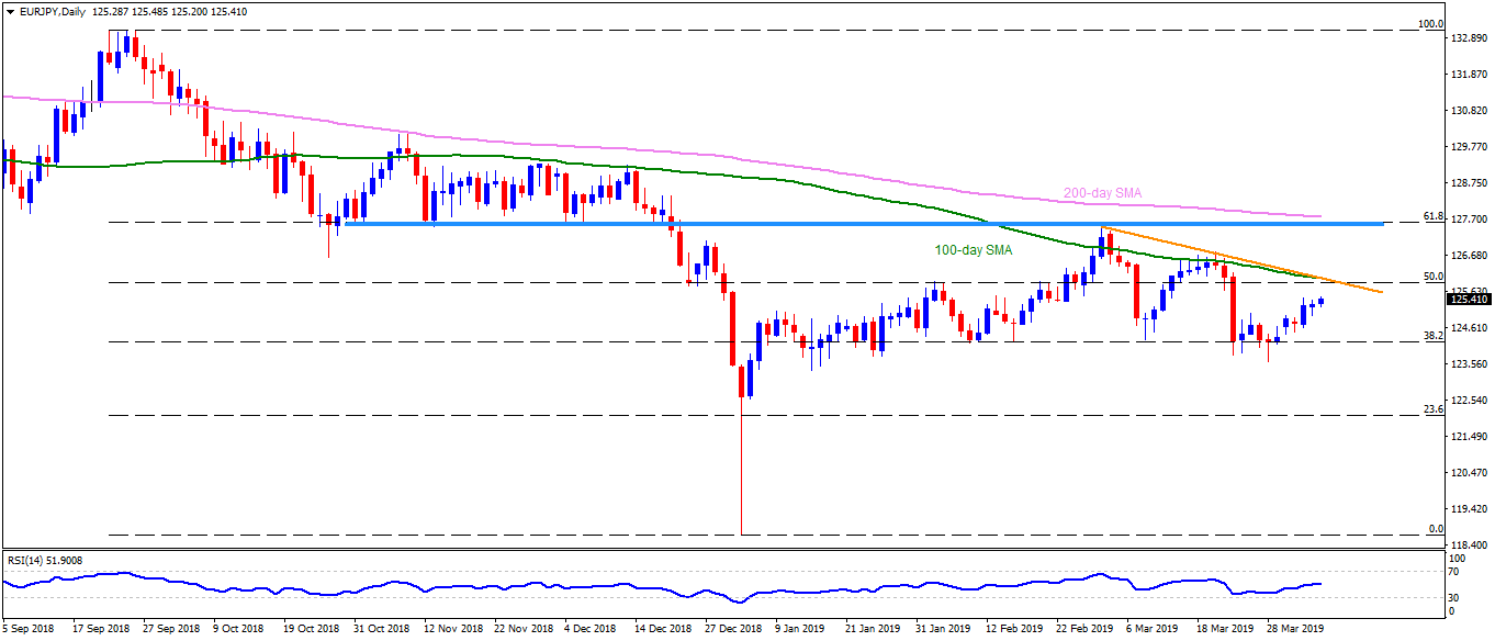 - EUR/JPY trades near 125.40 ahead of the European markets open on Friday. The quote has been on a recovery mode from 123.60 and is likely heading towards 125.90/126.00 resistance-confluence that comprises 100-day simple moving average (SMA) and immediate descending trend-line.