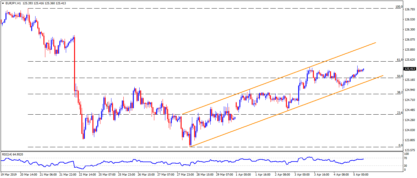 - A week-long ascending trend-channel offers 125.10 and 125.90 as the closest levels to watch.