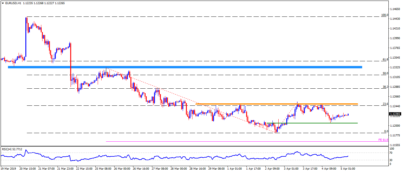EUR/USD is on the bids around 1.1230 ahead of the European open on Friday. Pair’s reversal from 1.1200 horizontal-support connecting multiple highs during April 02 signals brighter chances of its advances to 1.1250 resistance including current month tops.