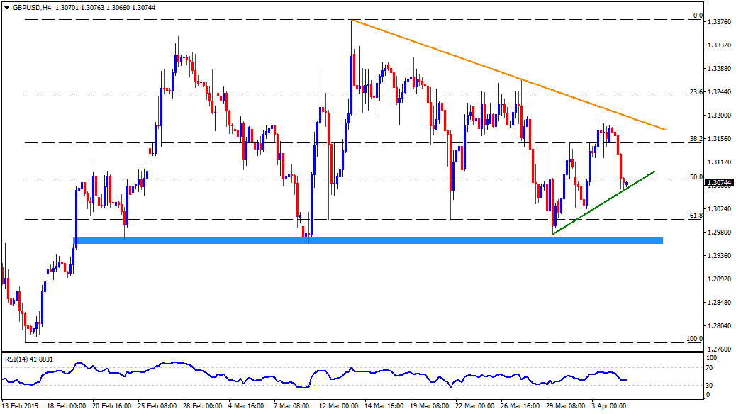The pair seems taking a U-turn from an upward sloping trend-line stretched since March 29, towards 1.3120 ahead of confronting the 1.3200 round-figure that now includes a descending resistance-line ranging from March 13.