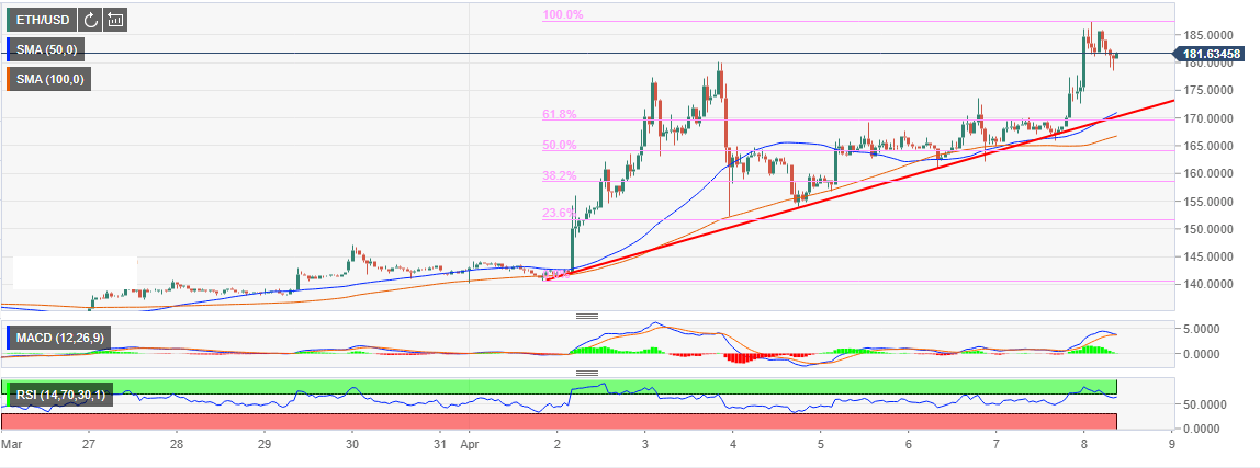 Although Ethereum bulls are targeting $200, the momentum lost steam short of $190 and formed a high at $187.51. In spite of the retracement from the highs, Ethereum is back to trading at the levels of November 2018. Besides, it is exchanging hands at $181.15 as the trend starts ranging. The RSI is horizontal at 64.44 after dropping from the overbought at 88.88. The MACD 1-hour at +4.0274 is in a downward slopping motion.