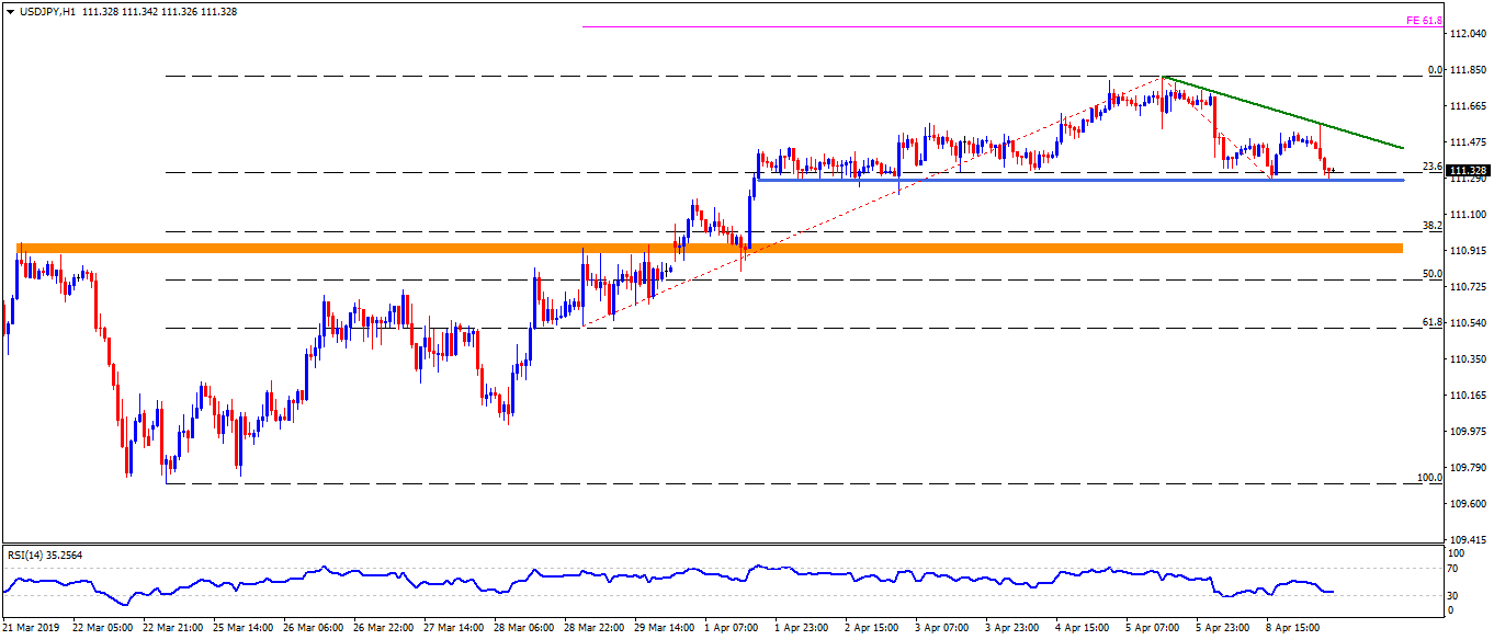 Meanwhile, a downward sloping trend-line stretched since Friday could limit the quote’s immediate upside near 111.55, a break of which can propel prices to 111.70 and recent highs near 111.85.