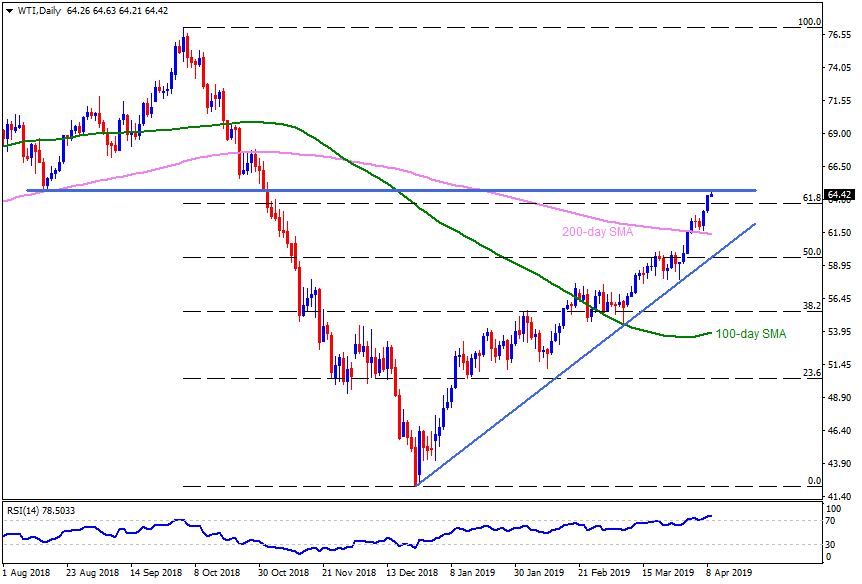 WTI is on the rounds near $64.50 ahead of European markets open on Tuesday. The black gold has been on an upward trajectory so far during 2019 but overbought RSI and $64.75/80 resistance-region challenges buyers at the moment.