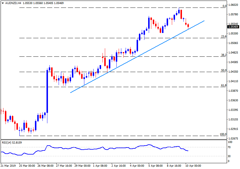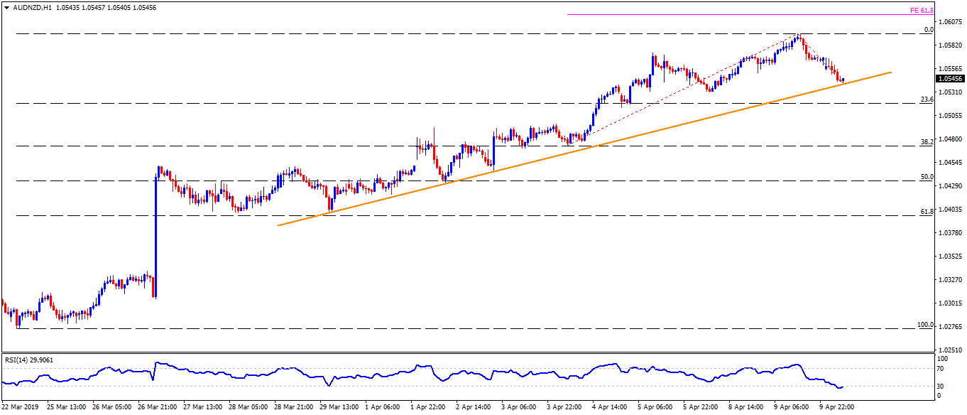 - AUD/NZD portrays pullback from 61.8% Fibonacci retracement of its August 2018 to January 2019 downturn as it presently trades near 1.0550 during early Wednesday.