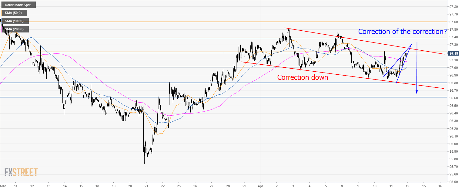 • DXY is currently in a correction down. The recent advance can be considered a correction of the correction. Failure for bulls to move above 97.20 and 97.40 can lead to a resumption of the down move.