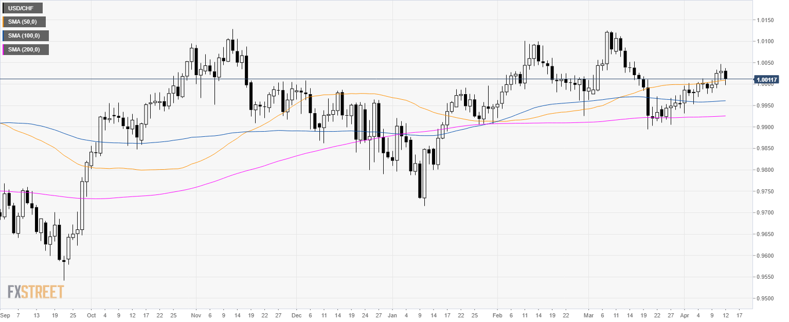 - USD/CHF is trading just above the 50-day simple moving average (SMA) and the parity level.
