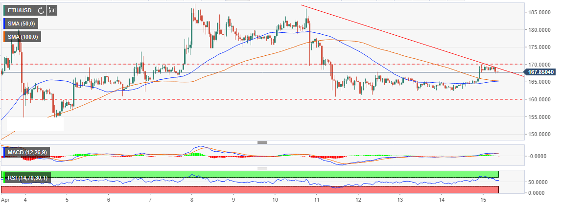 However, on breaking path both the 50 simple moving average (SMA) 1-hour and the 100 SMA 1-hour woke up the sleeping bulls. There was a brief surge on Monday but the upside has been capped at $170.00. ETH/USD is trending lower below the trendline resistance at $170.00 and the range limit at $170.00.