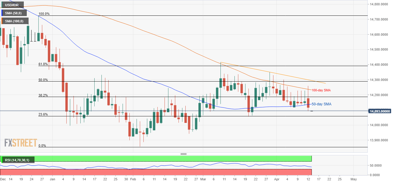 USD/IDR trades near 14,100 during early Monday. The quote dropped beneath 50-day simple moving average (SMA) for the first time in a month on Friday.