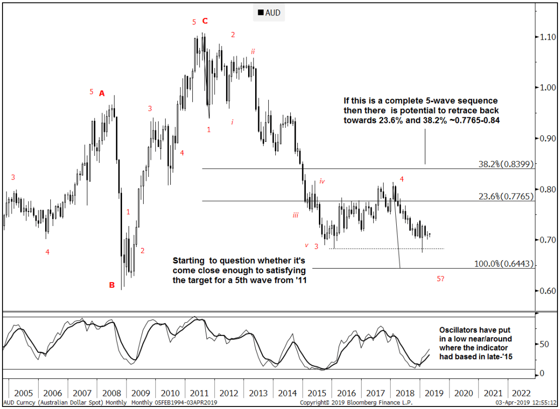 A typical 5th wave will test the bottom of its preceding 3rd; in this case, the low from Jan. ’16 at 0.6827. It will often exceed that level continuing on towards a minimum target derived from the length of wave 1; in this case 0.6443.