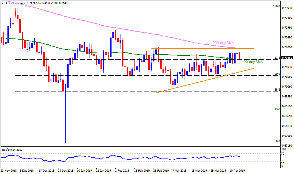 The Aussie pair recently bounced off the 0.7140 support-confluence comprising 61.8% Fibonacci retracement of its December 2018 to January 2019 downturn and 100-day simple moving average (SMA).
