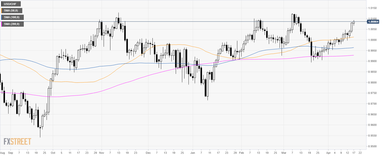 - USD/CHF is trading above the 50-day simple moving average (SMA) and the parity level.