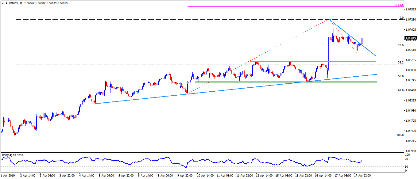 AUD/NZD is on the bids near 1.0680 during early Thursday. The pair broke a day-old trend-line resistance after Australia’s employment data broadly portrayed upbeat scenario.