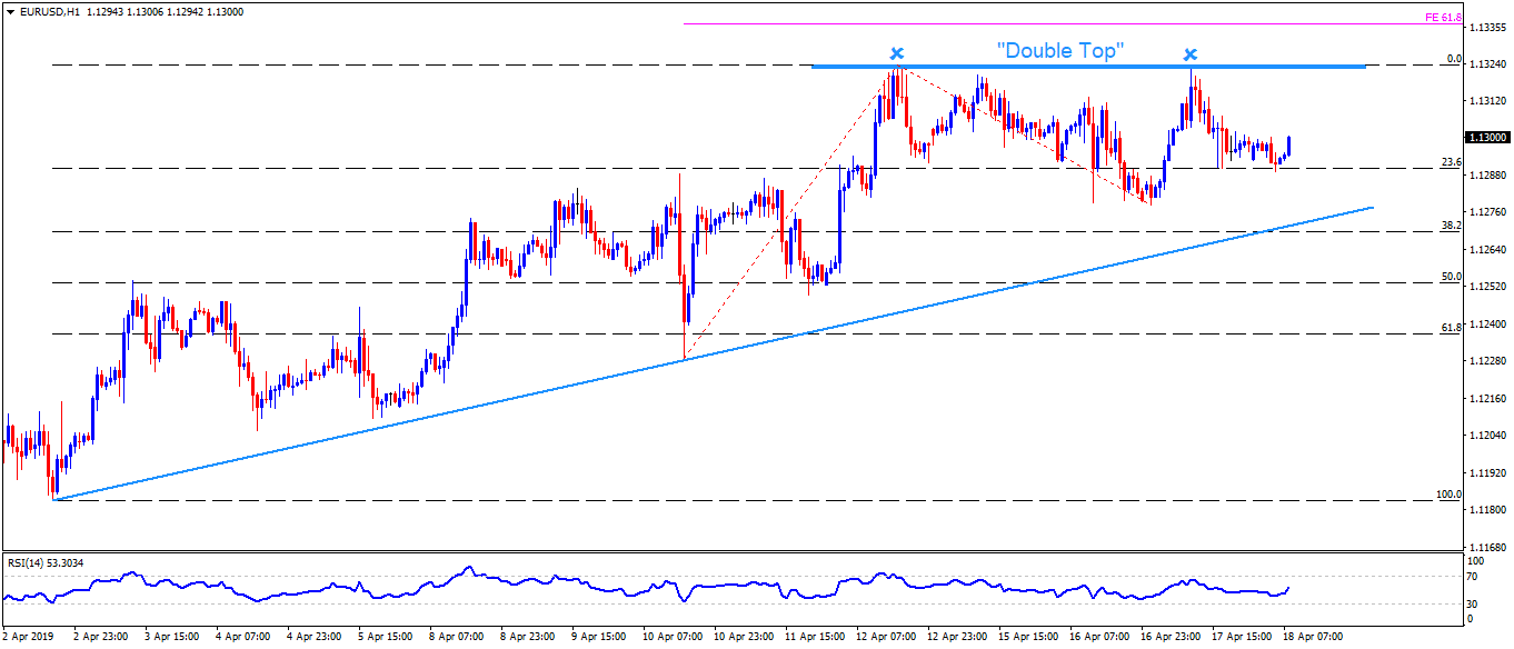 EUR/USD is taking the bids around 1.1300 ahead of the European open on Thursday. The pair highlights double tops near 1.1325 as a crucial resistance contrasts to an ascending trend-line stretched since early April.