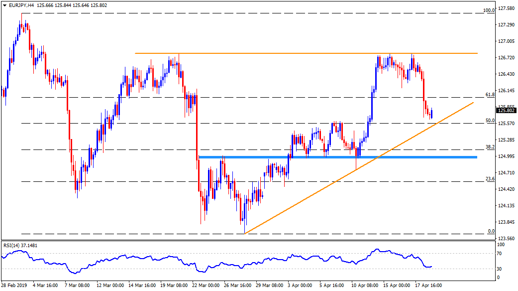 Having slipped beneath 61.8% Fibonacci retracement of March month decline, the EUR/JPY pair presently trades near 125.80 during early Friday.