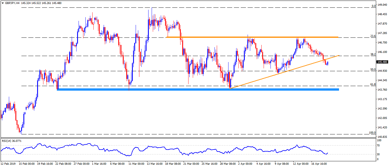 Pair’s break of three-week of upward sloping trend-line confirmed short-term ascending triangle break on Thursday, which in turn signals further downside to 144.85 and 144.60.
