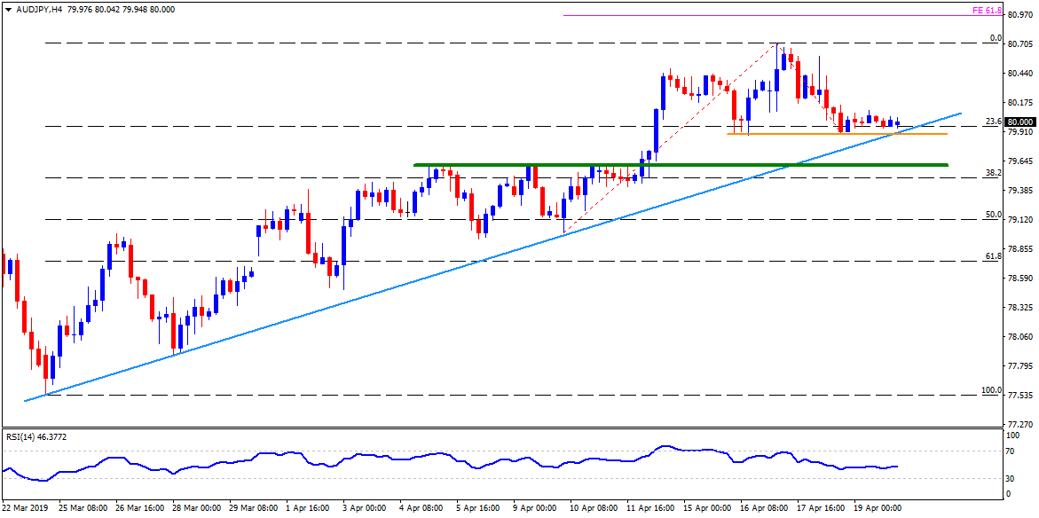Even if 14-bar relative strength index (RSI) shows bearish divergence on the 4-hour chart, a horizontal-line stretched since April 16 and a four-week-old ascending trend-line could challenge sellers around 79.90.