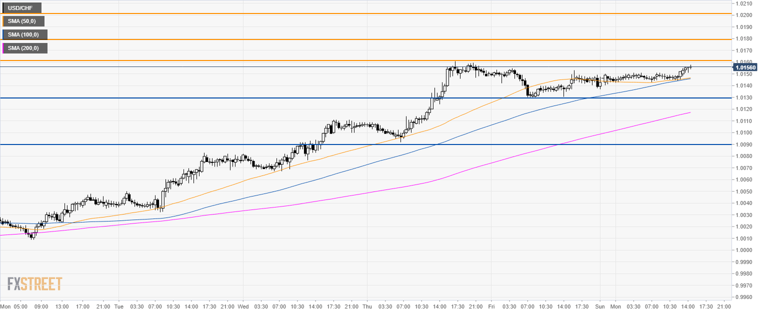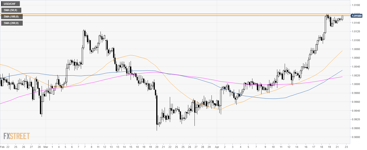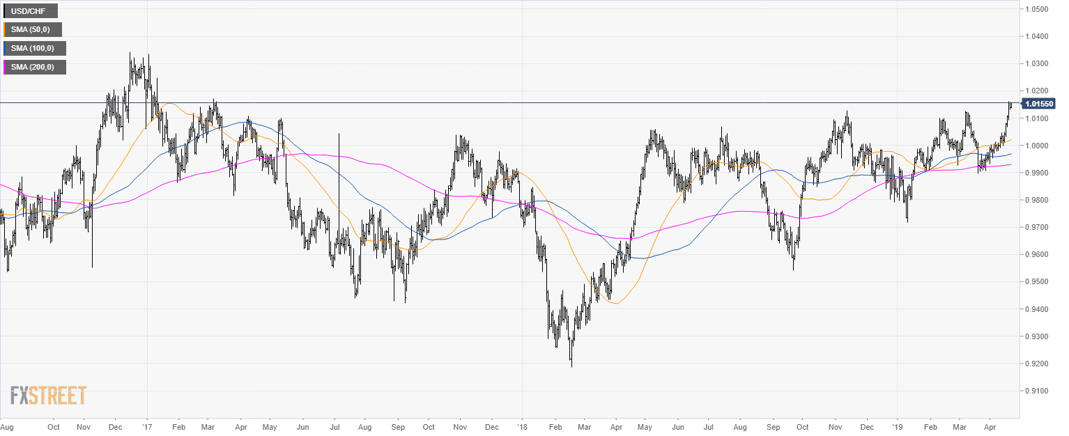 - USD/CHF is trading at its highest level since March 2017.