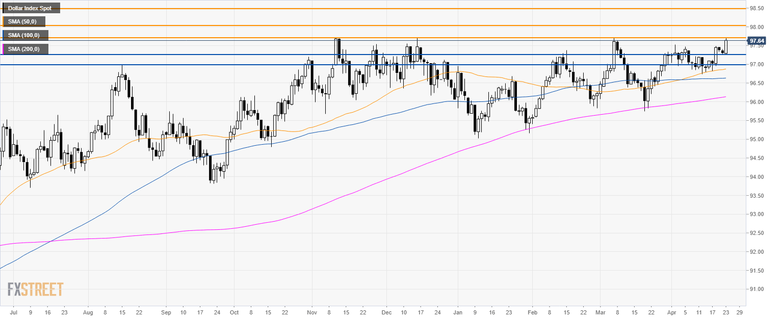 - DXY is challenging the 2019 high at the 97.71 level. If bulls manage to break above it, then 98.00 and 98.50 become the next resistances in line.