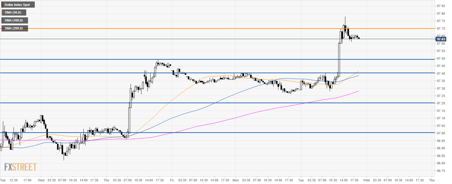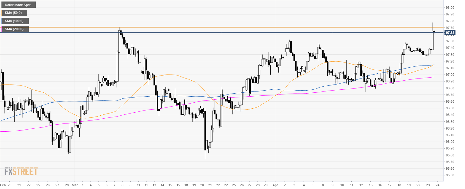 - DXY hit a new 2019 high at 97.78 during the North American session.