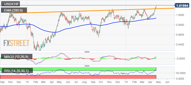 USD/CHF Technical Analysis: Taps 1.0200 mark for the first time since Jan. 2017, overbought conditions warrant some consolidation