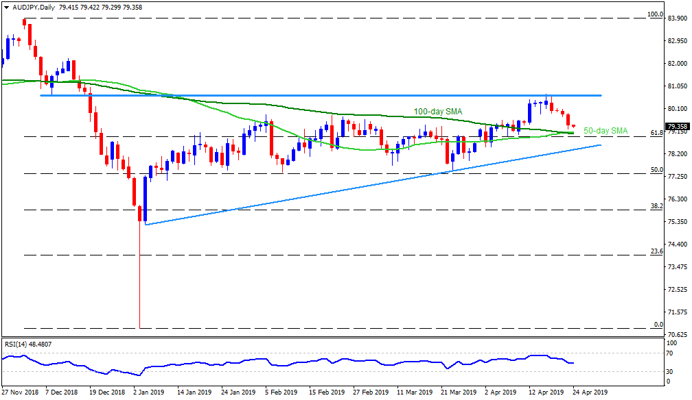 Presently, 50-day and 100-day simple moving average (SMA) confluence region around 79.15 – 79.05 could challenge sellers, a break of which highlights the importance of 61.8% Fibonacci retracement of December – January downturn near 78.90.