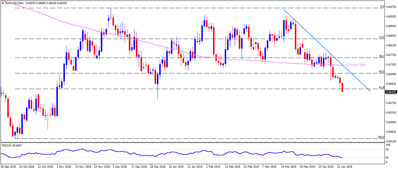 The pair has already dipped beneath 61.8% Fibonacci retracement of its October to December 2018 upside, signaling brighter chances of further declines towards late-October highs near 0.6610 followed by January month low around 0.6585.