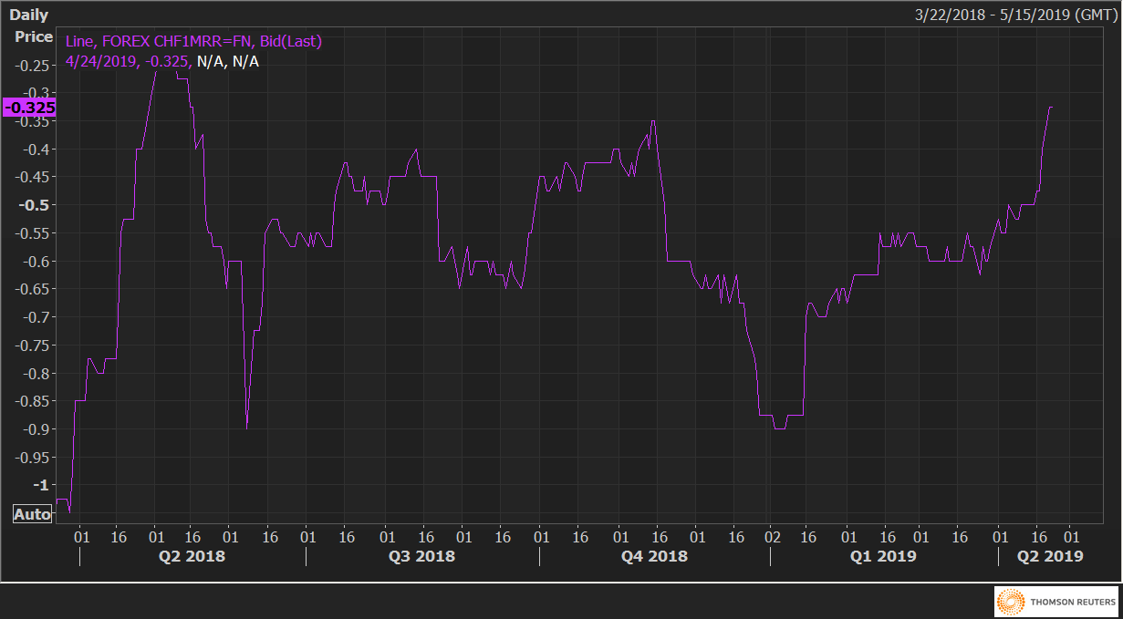 USD/CHF one-month 25 delta risk reversals are currently trading at -0.325, the highest level since May 16, 2018.