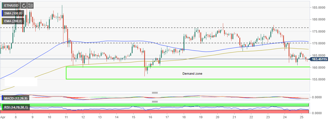 On April 18, Ethereum bulls pushed for a correction above the initial range limit at $170. However, Ethereum escaped one range resistance only to fall into another whose upside was capped at $176.62. Following several days of consolidation above the 200 EMA 2-hour, ETH/USD was caught up in the bear pressure on the market on Wednesday leading to a plunge not only below $170 but also next support target at $165. This time, the price formed a low at $161.01 and while taking advantage of the demand zone commenced the current consolidation phase.