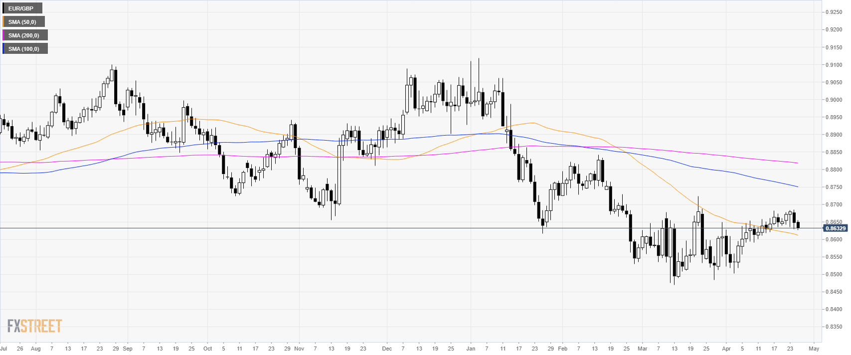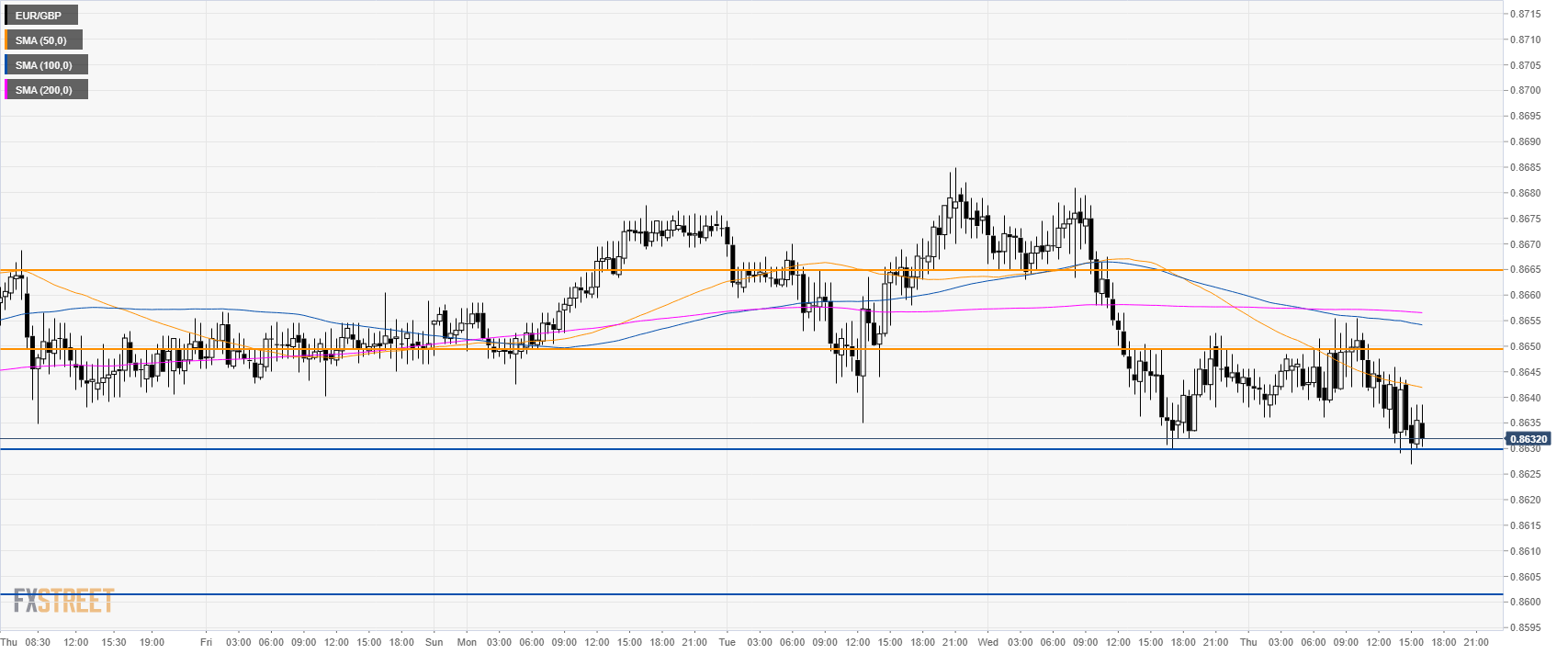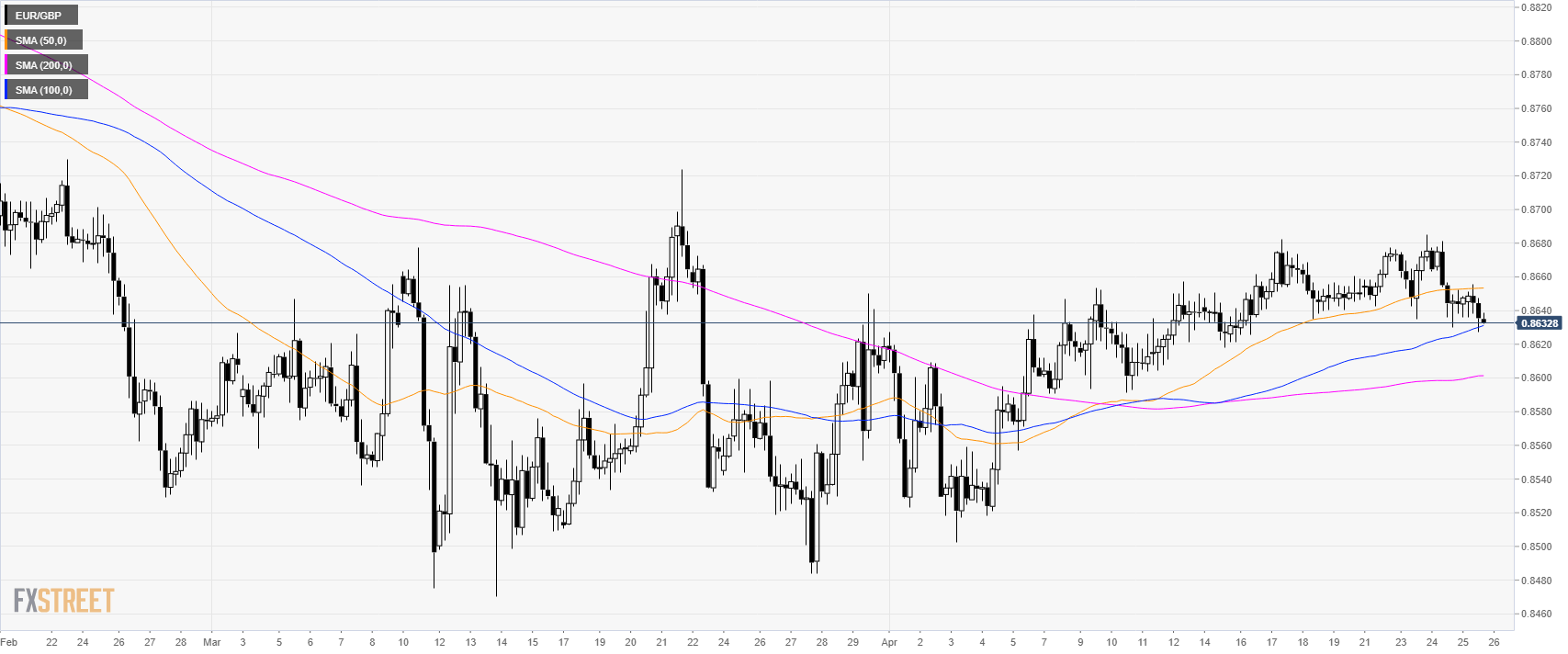 - EUR/GBP is trading below its main SMAs as the bears are challenging the 0.8630 support.