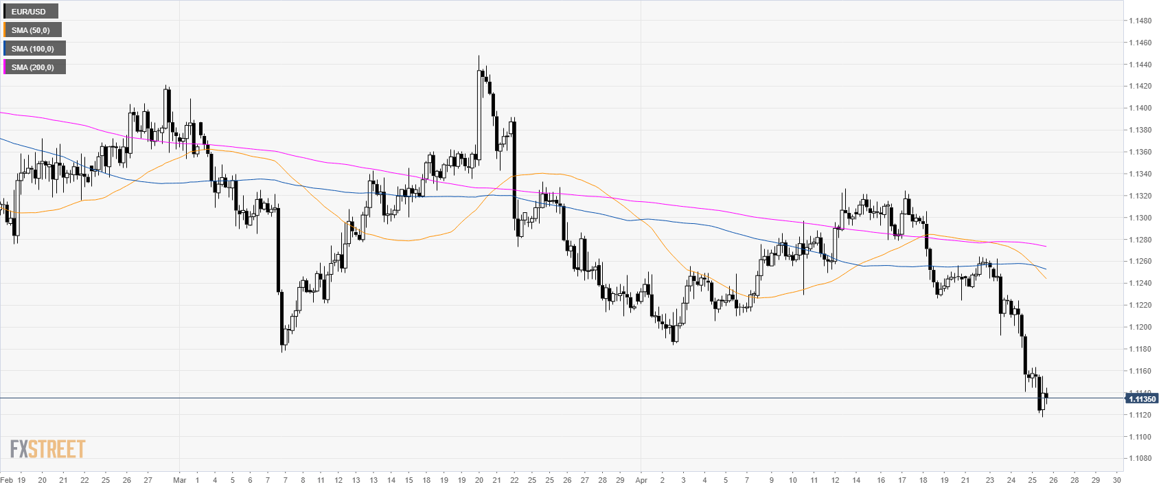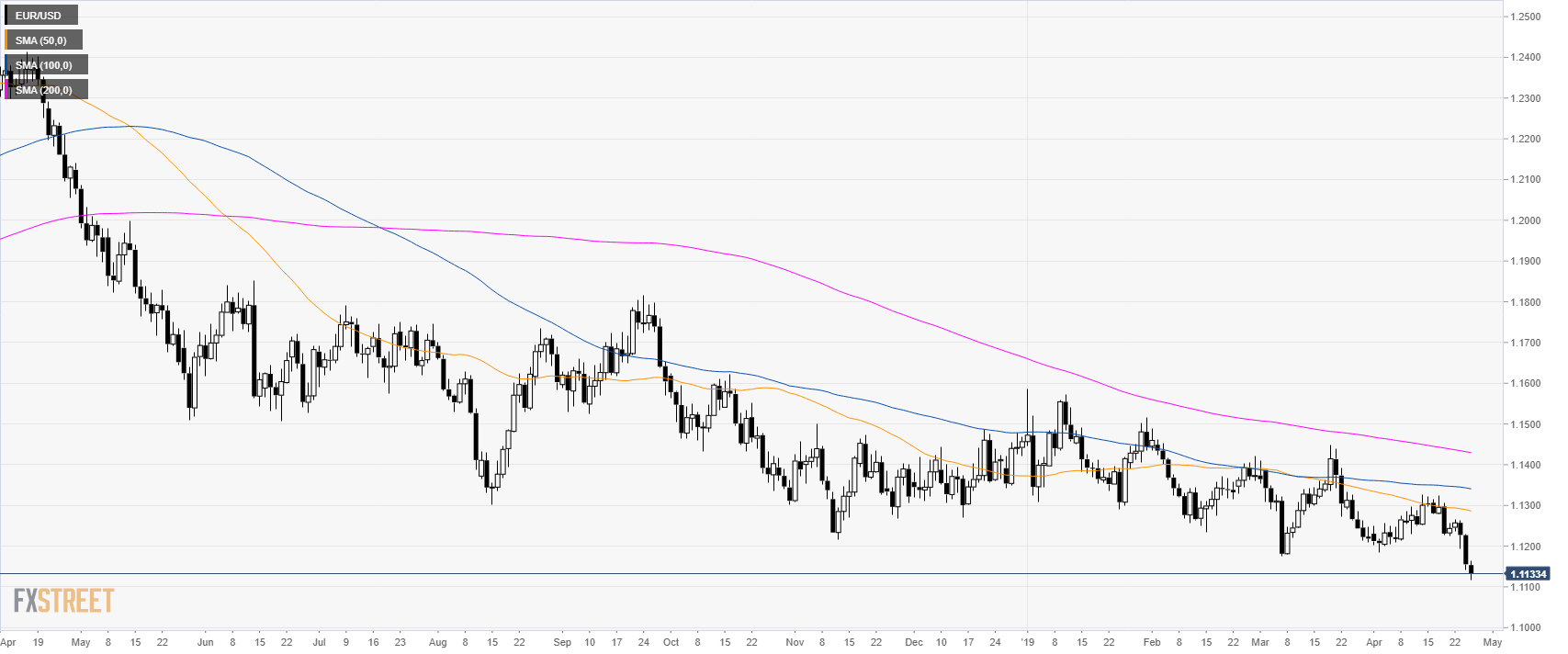 - EUR/USD is trading in a bear trend below its main simple moving average (SMAs).