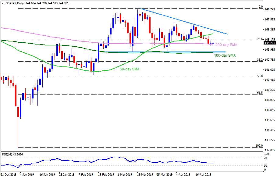 Having bounced off 200-day simple moving average (SMA), the GBP/JPY pair is on the bids around 144.80.