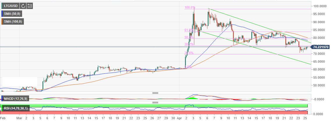 Meanwhile, attempts to beat the bearish pressure in the three weeks have failed miserably. At the time of writing Litecoin is trading at $74.36 while battling the resistance at the 38.2% Fibo. LTC/USD needs to zoom above this hurdle in order to enter a bullish zone between $75 and $80.