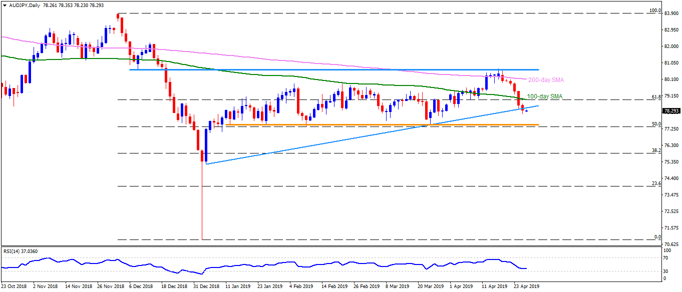 Meanwhile, an upside clearance of 78.50 support-turned-resistance can trigger the pair’s recovery in direction to 78.95 – 79.00 area including 100-day simple moving average (SMA) and 61.8% Fibonacci retracement level of December 2018 to January 2019 decline.