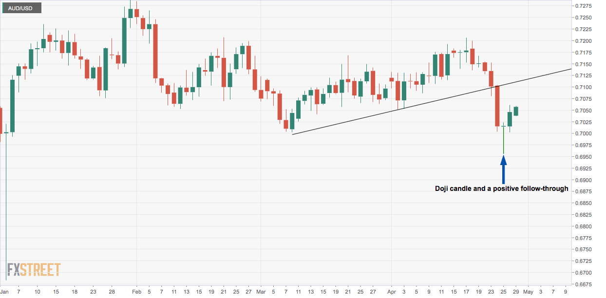 AUD/USD is currently trading at session highs above 0.7055, having neutralized the immediate bearish view with a 0.30 percent gain on Friday.  The pair picked up a bid on Friday following the US first quarter GDP release and ended in green,  validating the Doji candle created  on Thursday.