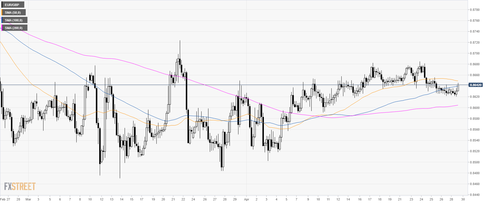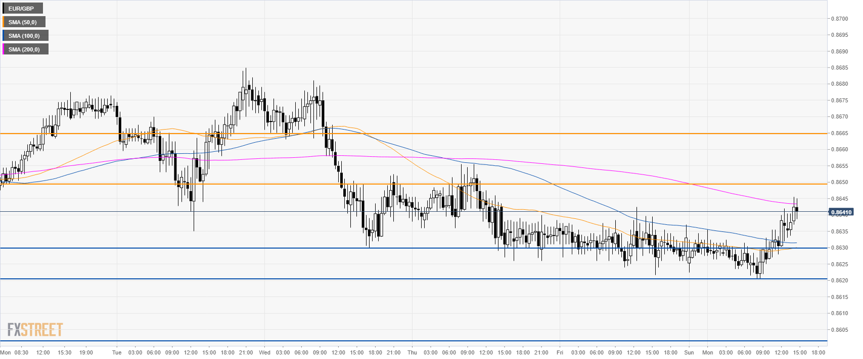 - EUR/GBP is grinding towards 0.8650 resistance and the 200 SMA.