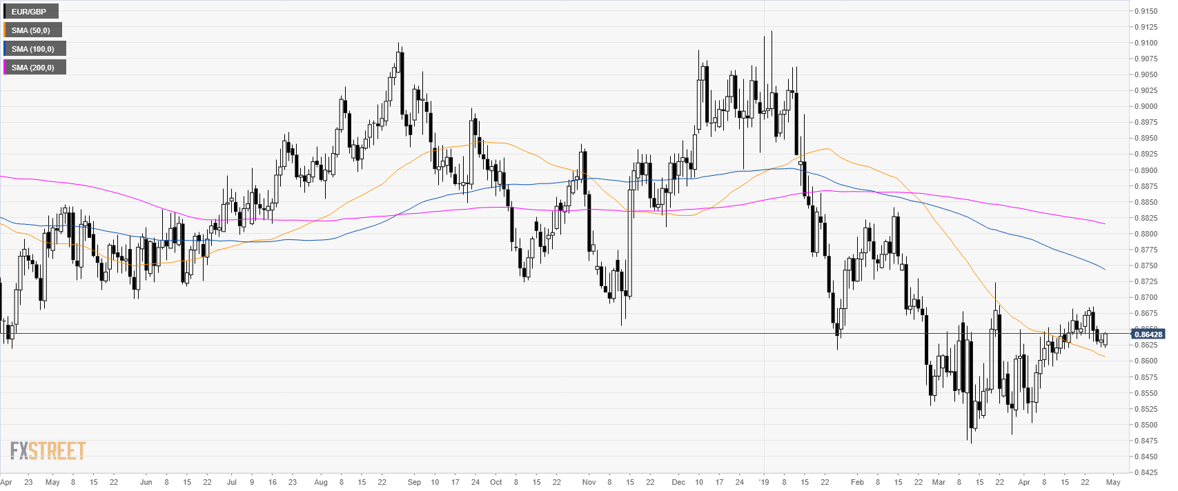 - EUR/GBP is evolving in a bear trend below its 100 and 200 simple moving averages (SMAs).