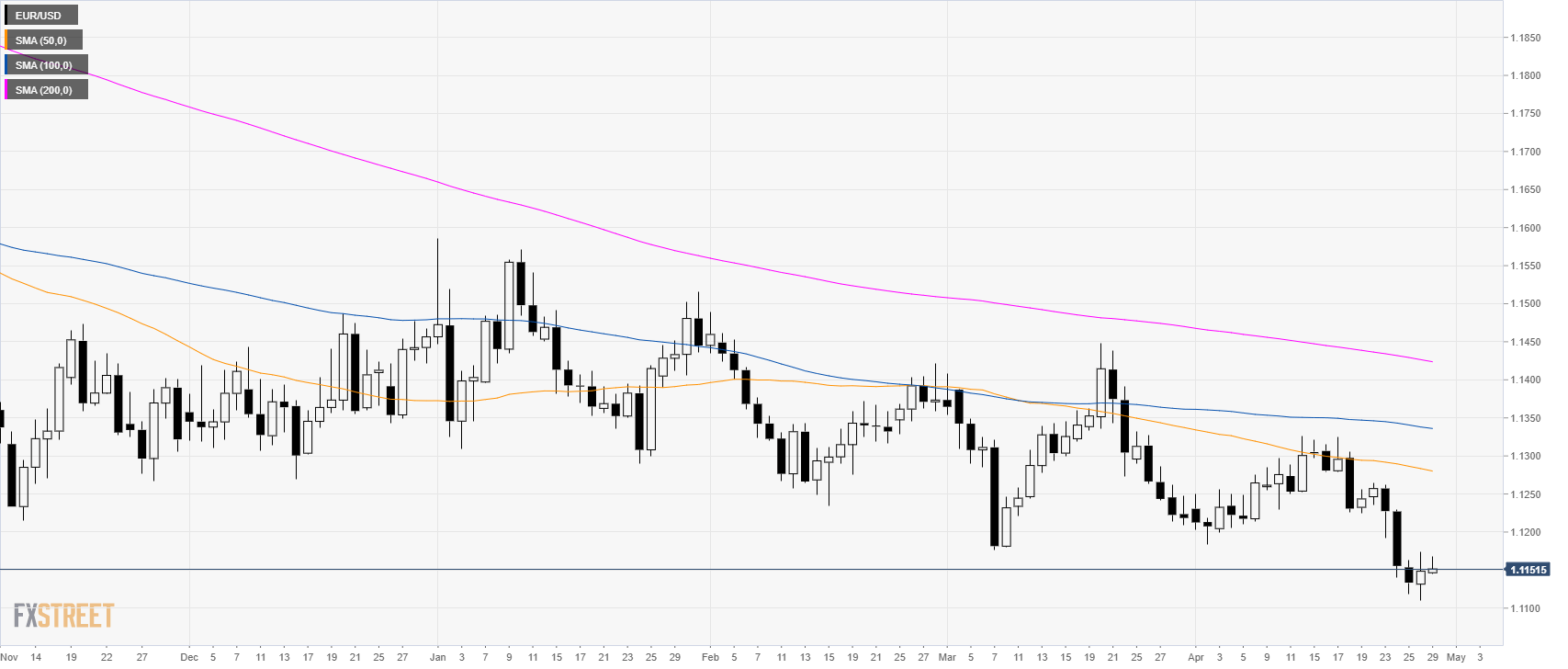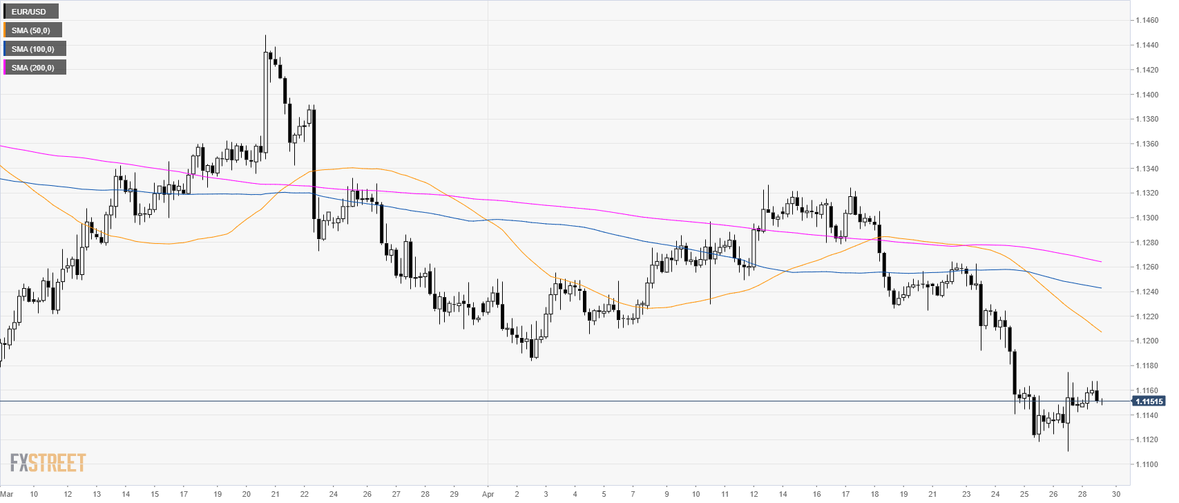 - EUR/USD is trading in a bear trend below its main simple moving average (SMAs).