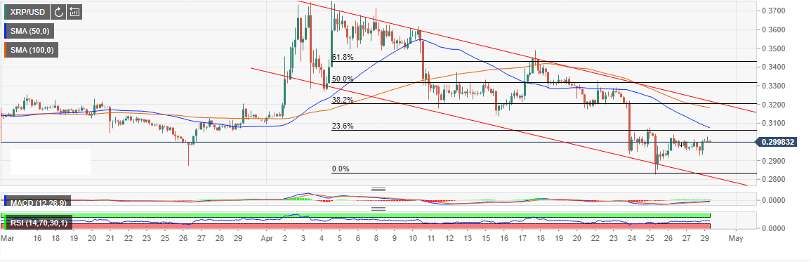 XRP/USD is up a subtle 0.05% on Monday to trade at $0.300. The price seems to be cultivating sideways trading following the stormy weather experienced last week across the market. Unlike, other major cryptocurrencies, Ripple was among the worst hit with declines hitting lows close to $0.2800.