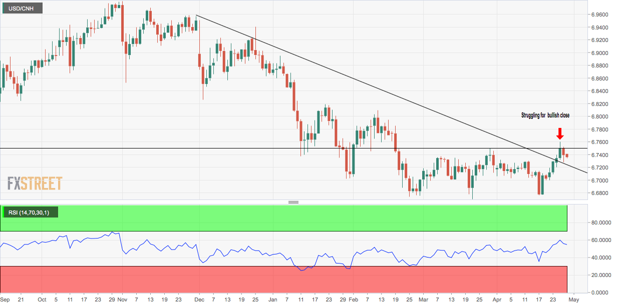 USD/CNH technical analysis: Bullish close above 6.75 remains elusive