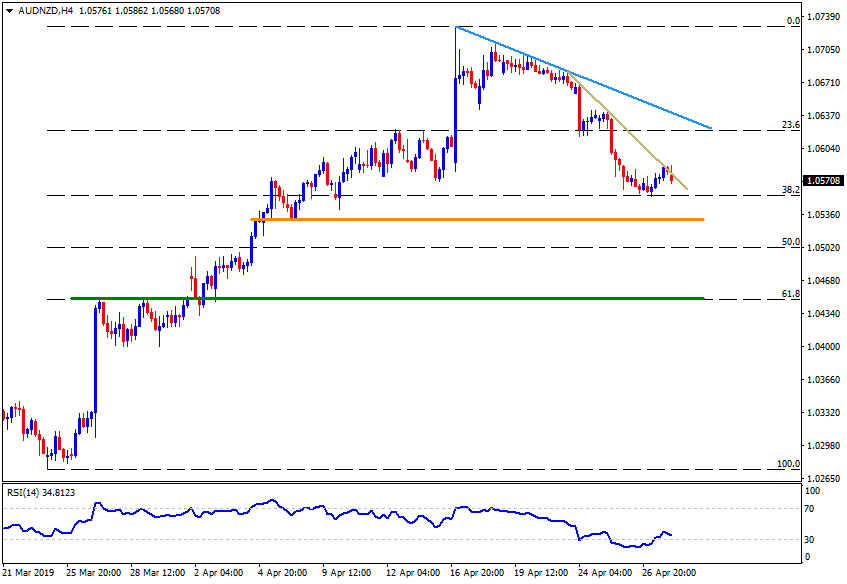 Despite recovering from 38.2% Fibonacci retracement of March 25 to April 17 upside, AUD/NZD failed to clear immediate trend-line resistance and is presently indicating 1.0555/50 support re-test while trading around 1.0570 during early Tuesday.