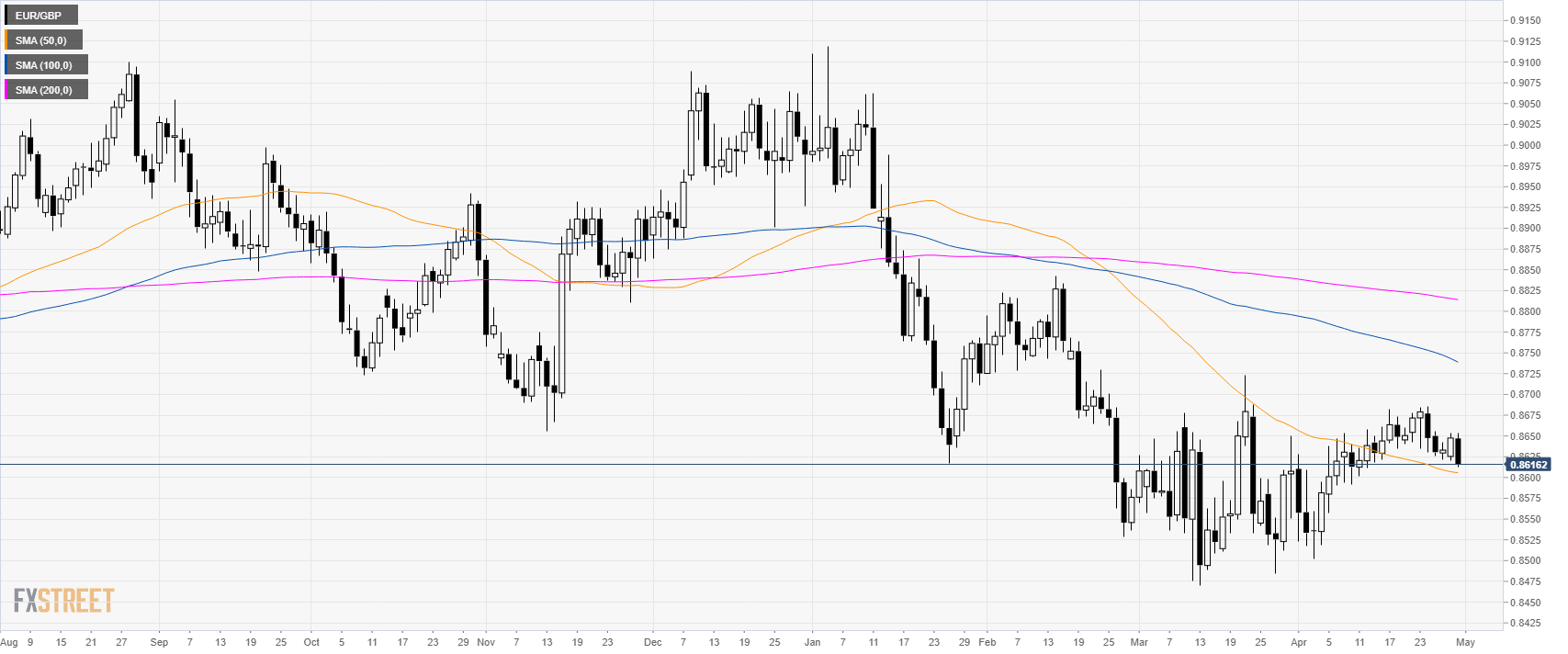 • EUR/GBP is trading below its 50 and 100 SMAs suggesting a downward correction in the medium-term.