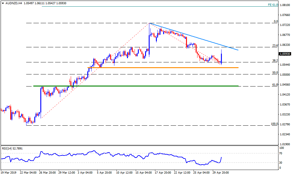 38.2% Fibonacci retracement of March to April upside, at 1.0555, has offered frequent bounces to the quote off-late, which in turn shifts market attention to a downward sloping resistance-line since April 17, at 1.0635 now.