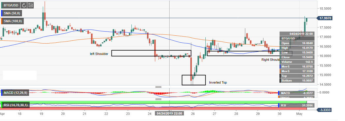 BTG/USD is among the biggest single digit gainers on Wednesday. Intraday charts show a formidable 4% increase in value on the day. Moreover, Bitcoin Gold is trading above both the 50 Simple Moving Average (SMA) and the 100 SMA 2-hour.