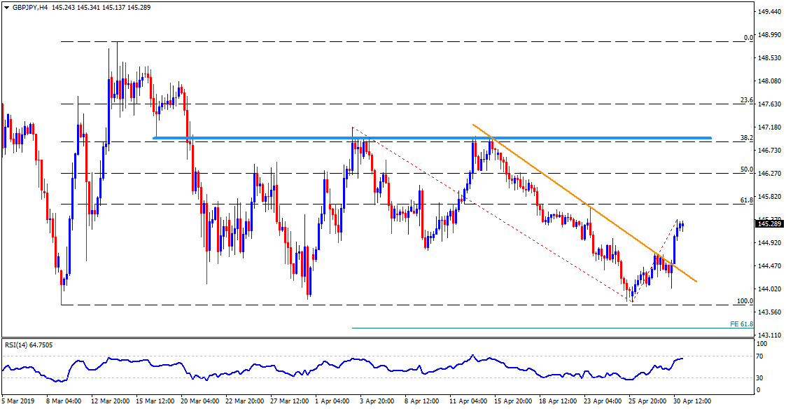 The GBP/JPY pair is on the bids around 145.30 during early Asian sessions on Wednesday. The pair recently crossed a two-week-old descending trend-line but is struggling with overbought conditions of 14-bar relative strength index (RSI) to target 61.8% Fibonacci retracement of its March month’s rise.