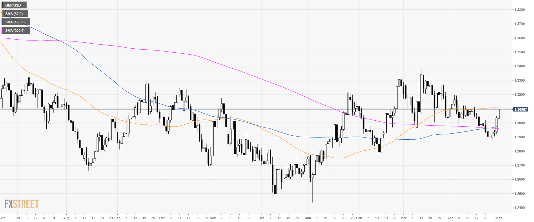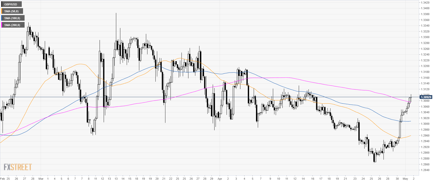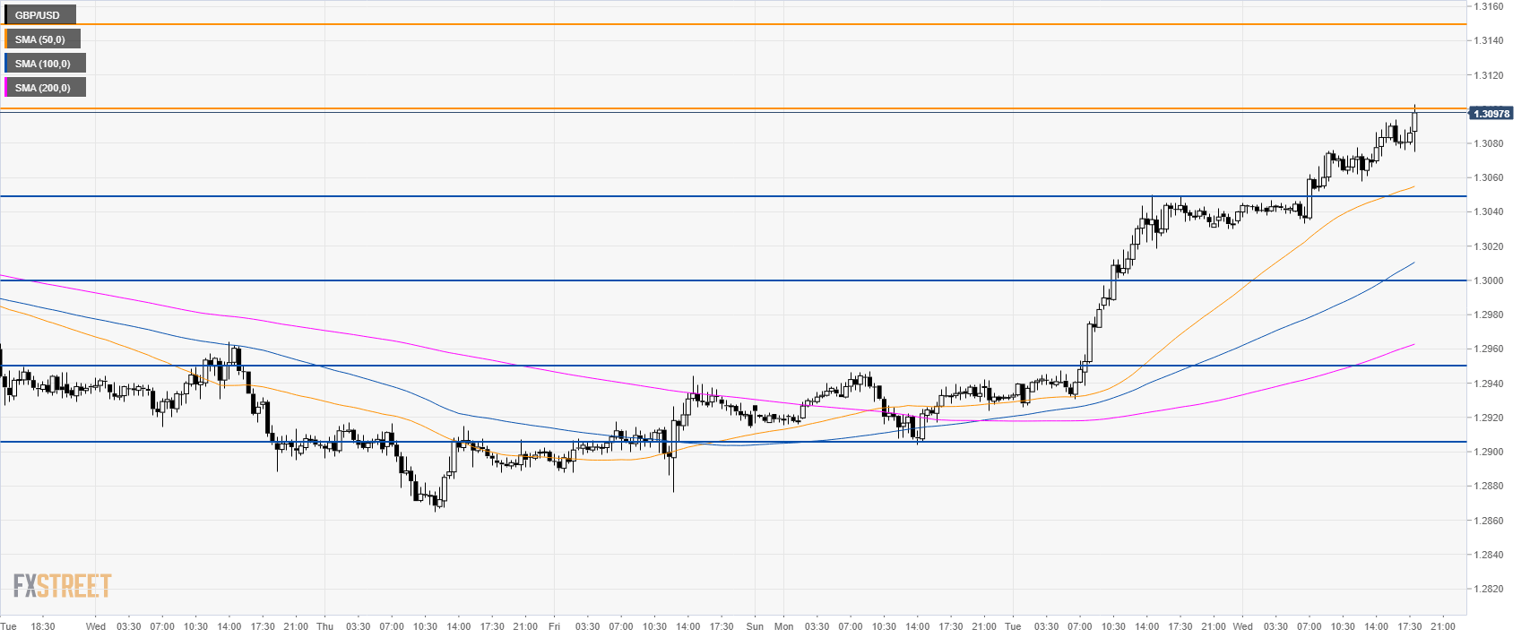 - GBP/USD is trading above its 100 and 200 SMAs as the market is testing the 1.3100 figure and the 50 SMA.