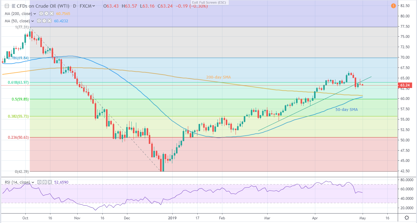 The energy benchmark presently trades near $63.30 and signals brighter chances of revisiting 200-day simple moving average (SMA) level of $60.80. However, $61.80/60 region including lows since April 02 may offer intermediate halt amid downside.
