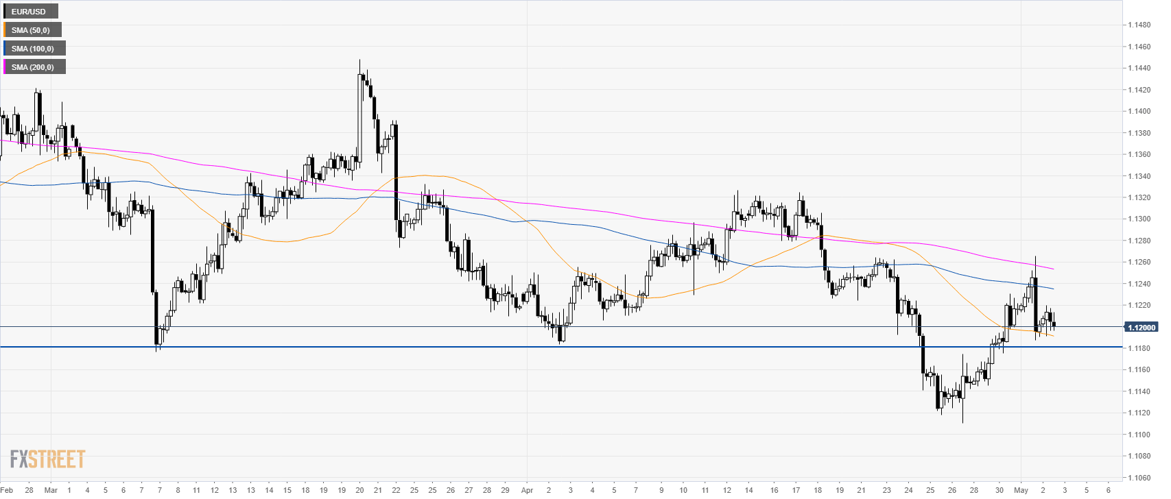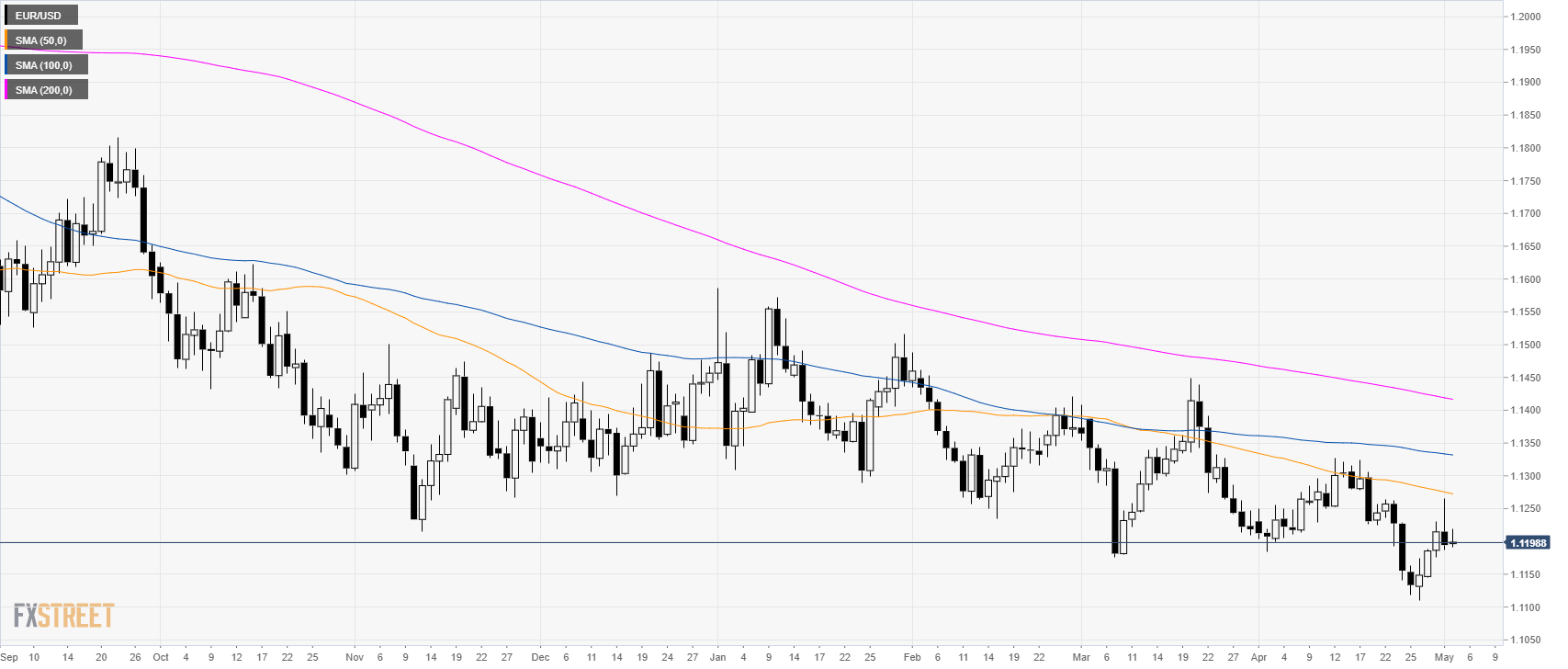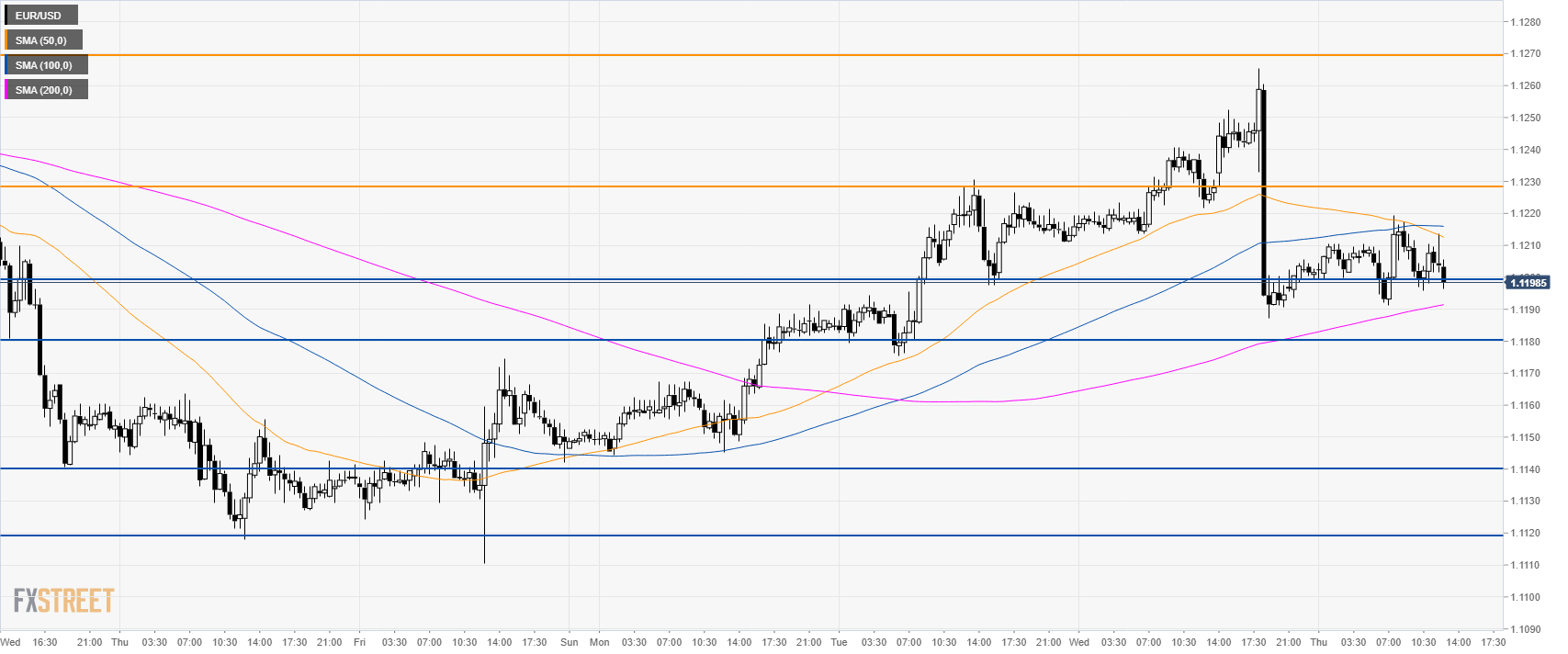 • EUR/USD is trading below its 100 and 200 SMA as the bears generated a strong selloff to 1.1187 and the 50 SMA.