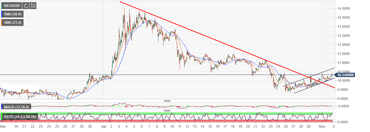 The reversal from the key support has placed NEO in a new uptrend within an ascending channel. In addition to that, there was a break above the month-long descending trendline resistance while supported by both the 21 simple moving average and the 50 SMA 1-hour. A break occurred above $10.00 broken support and tested $10.50 without success.